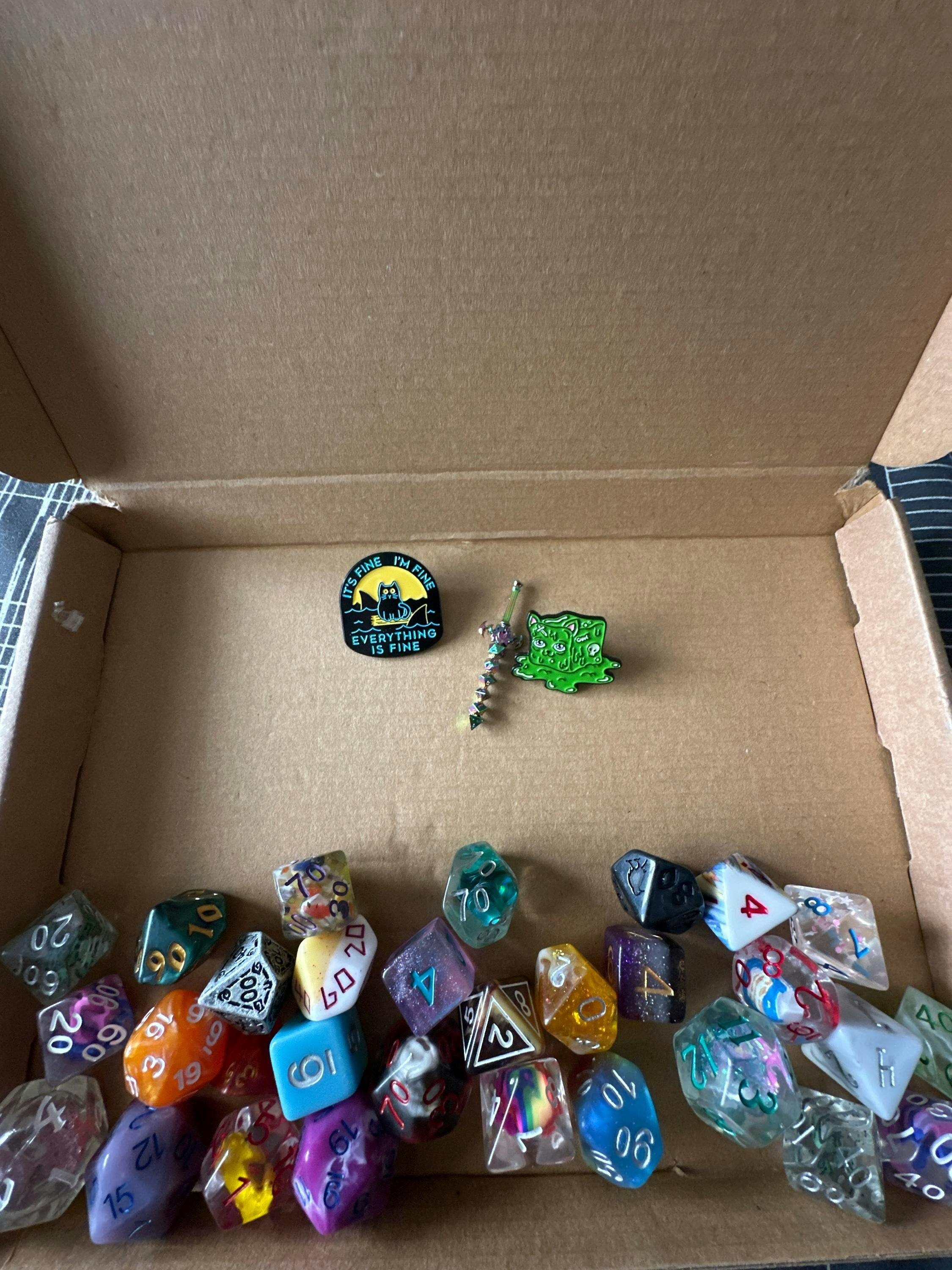 I am happy with the dice, stickers, and pins in the mystery bags. The problem is the pins and dice riped through the side of the paper bags and escaped into the box during transit. Instead of three mystery bags I recieved one mystery box with three scoops. This was meant to be three 'Easter baskets' (thin excuse to buy dice but why shouldn't adults get Easter gifts too?) for me and my gaming group. I imagined opening them together and haggling for loot from each others Mystery bags...but the surprise was ruined for me. If I had written this review right after opening the box I would have rated it 3 stars, but I got over the disapointment and with a generous amount of tape re-asembled the mystery bags. All is well that ends well.