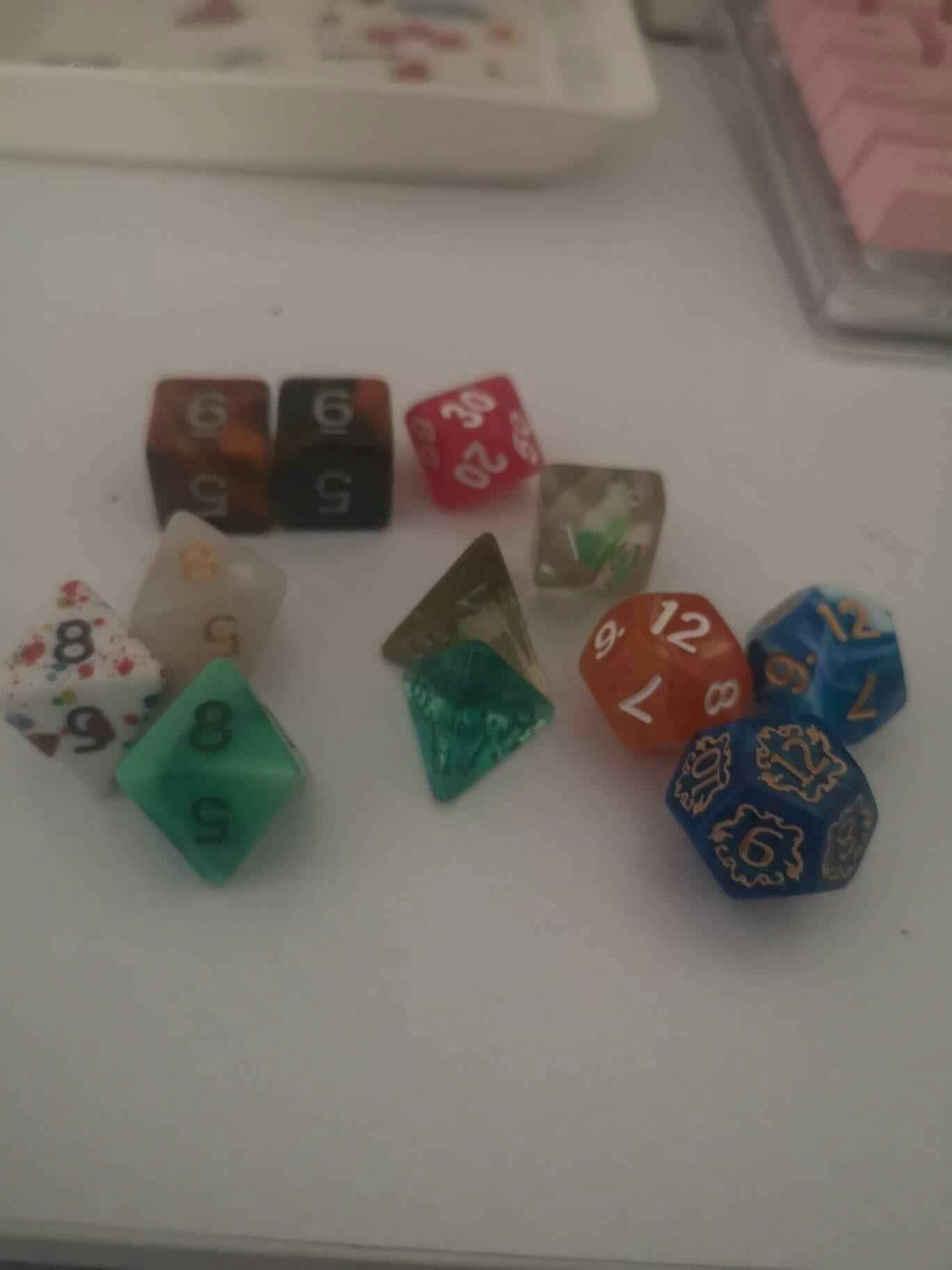 Delivery was quick, expected selection of dice. I received no d20 but I'm fine with that, my 2 d6 look like they're from very similar sets, another 2 dice look like they're from the same set with an unidentified thing in them. One d12 is definitely a duplicate from a set I received from this seller which I'm actually quite pleased with. This selection was expected, there is some dice I would love to find a full set of, others I wouldn't have chosen for myself. Like I said, an expected selection. I will probably buy again
