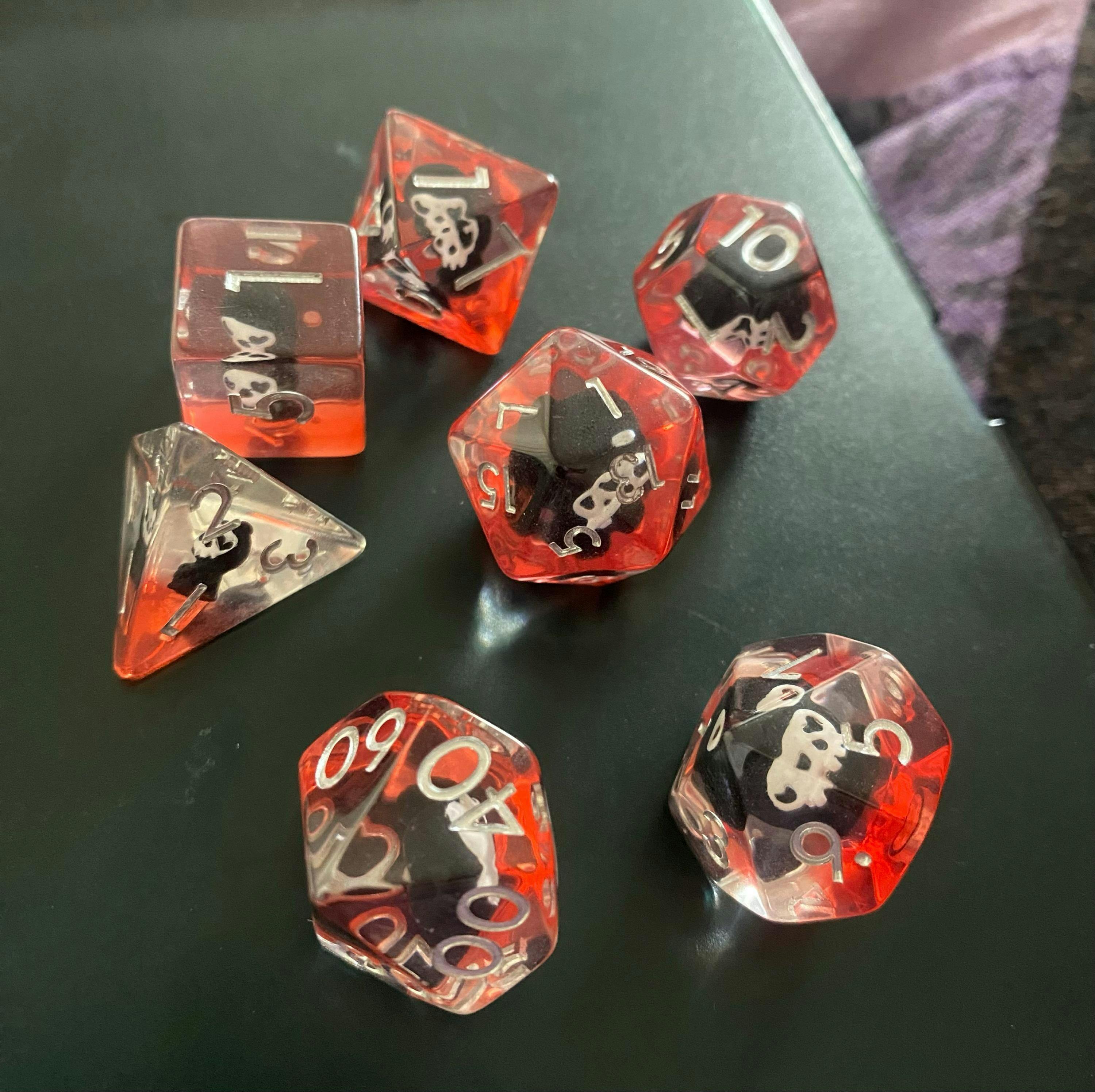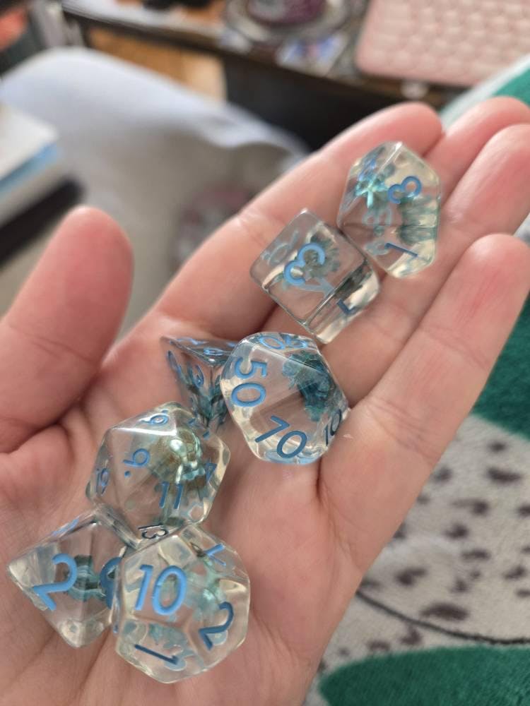 Each bag contains a matching set of inclusion dice from our WIDE collection (form mushrooms, to unicorns all the way to dragon's eyes and little tieflings!)