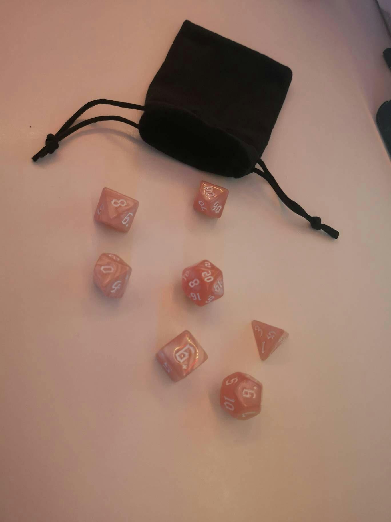 Velvet bag has a nice feel to it, dice look really pretty. Good quality feel, look and sound. Would recommend to any dice collecters.